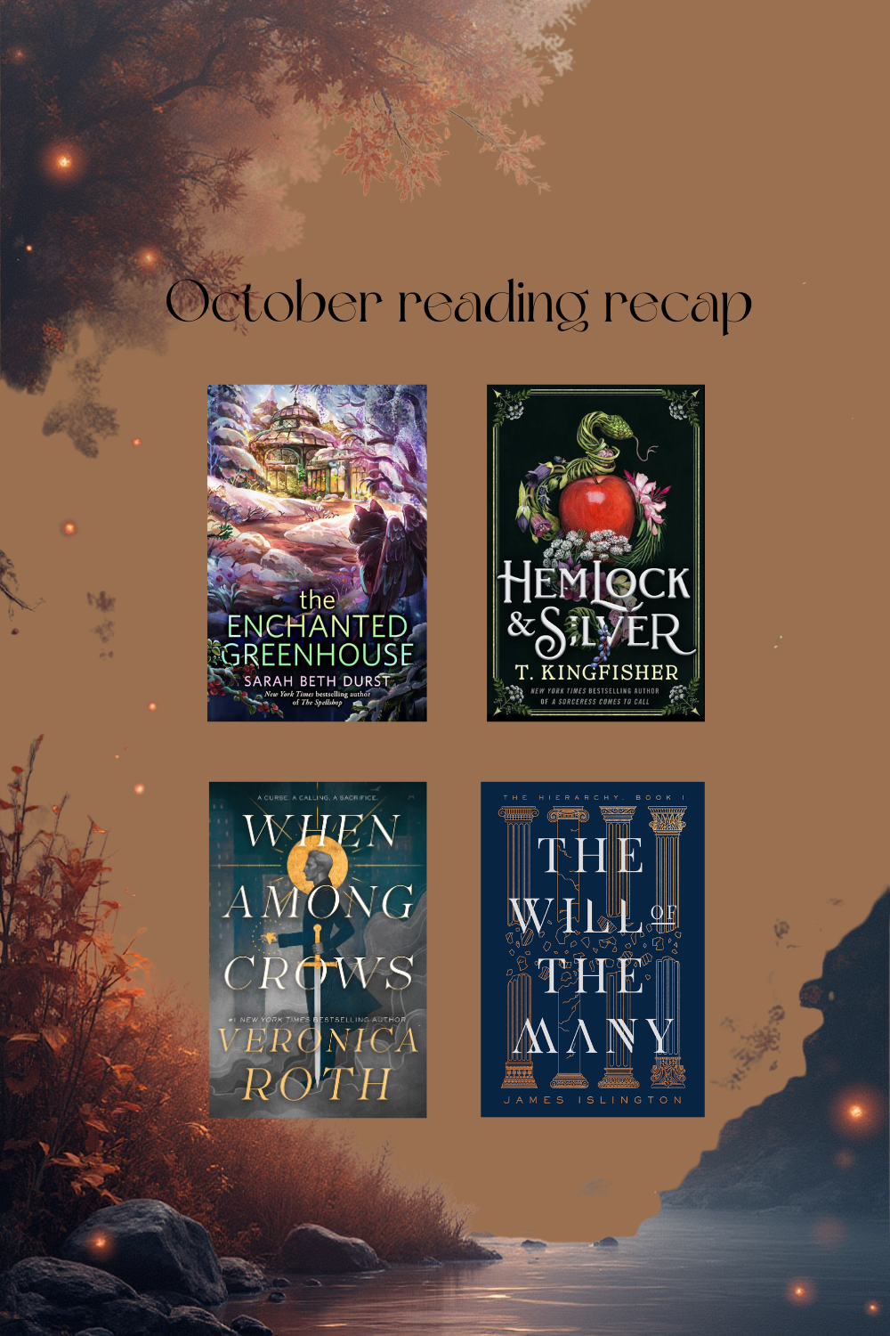 It’s the perfect reading time for me, so I managed to read The Enchanted Greenhouse by Sarah Beth Durst, Hemlock & Silver by T. Kingfisher, When Among Crows by Veronica Roth, and The Will of the Many by James Islington.